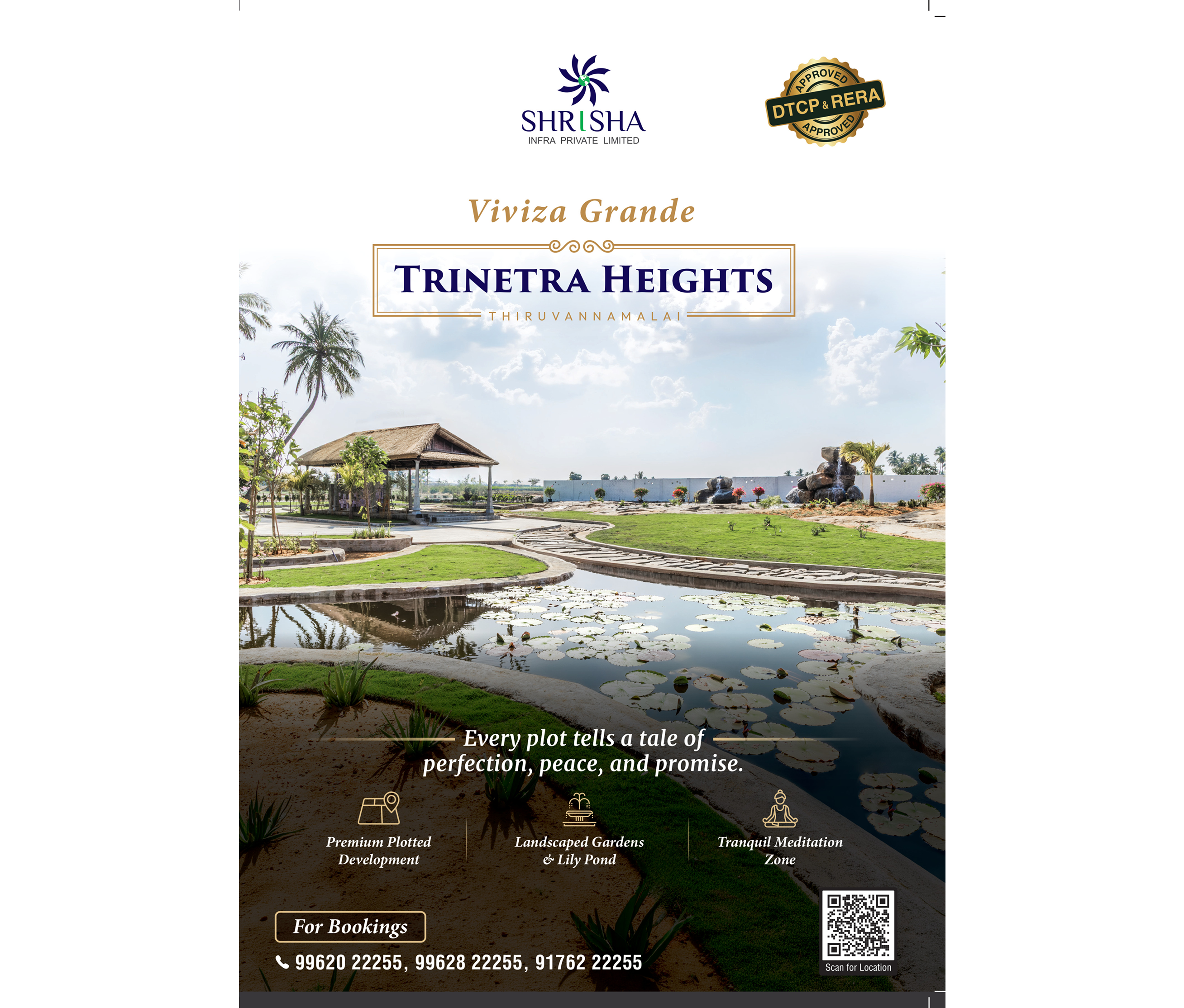 Shrisha Infra proudly unveils Phase 11 of Viviza Grande – Trinetra Heights in Tiruvannamalai - the continued expansion of a well-established township following the successful sales of 10 previous phases. Strategically located just 10 minutes from the revered Arunachaleswarar Temple and close to Sri Ramanasramam, Phase 11 offers a rare opportunity to be part of a growing residential community in one of South India’s most spiritually significant destinations. The project reflects structured planning, organized layout development, and a long-term vision that has consistently guided the expansion of Viviza Grande.