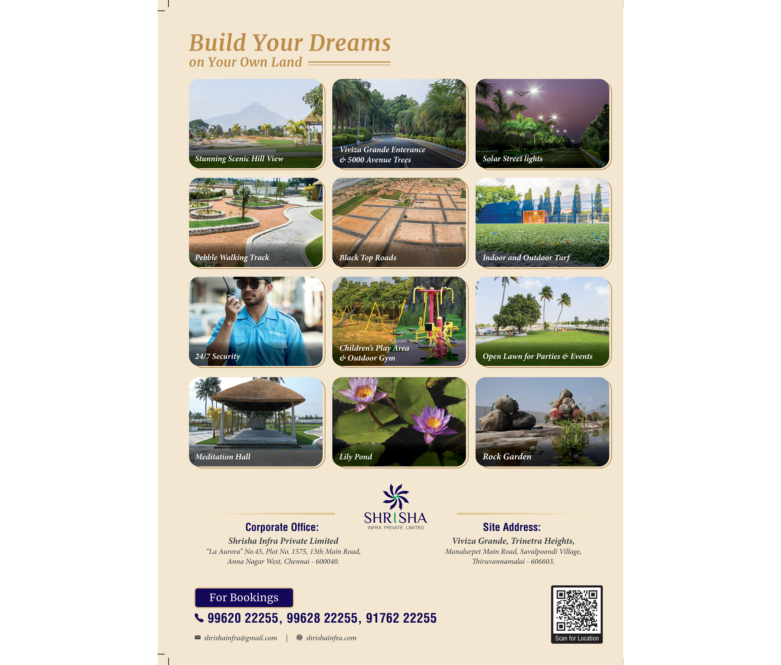 Tiruvannamalai continues to attract devotees, residents, and forward-thinking investors due to its spiritual prominence, tourism-driven demand, and expanding infrastructure. For buyers seeking secure land ownership beyond metropolitan limits, Phase 11 represents both emotional value and strategic investment potential. Backed by Shrisha Infra’s phased development track record, this release offers the confidence of continuity and the advantage of entering at a progressive stage of growth in a high-demand temple town.
